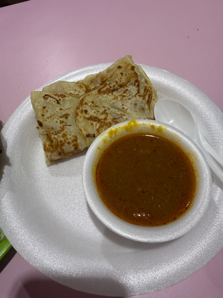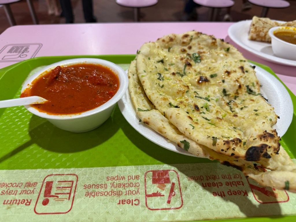 One we were done at the temple the meal we were about to have was one of the most anticipated for us especially Ronnie who loves Indian food. We ate at Tekka Centre, another hawker centre. We ordered from Delhi Lahori which is a highly recommended hawker stall there. We got the butter chicken set that came with two big pieces of garlic naan and a roti Prata with onions served with a vegetable curry.