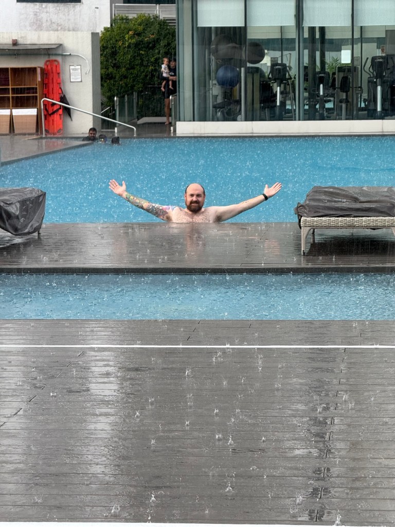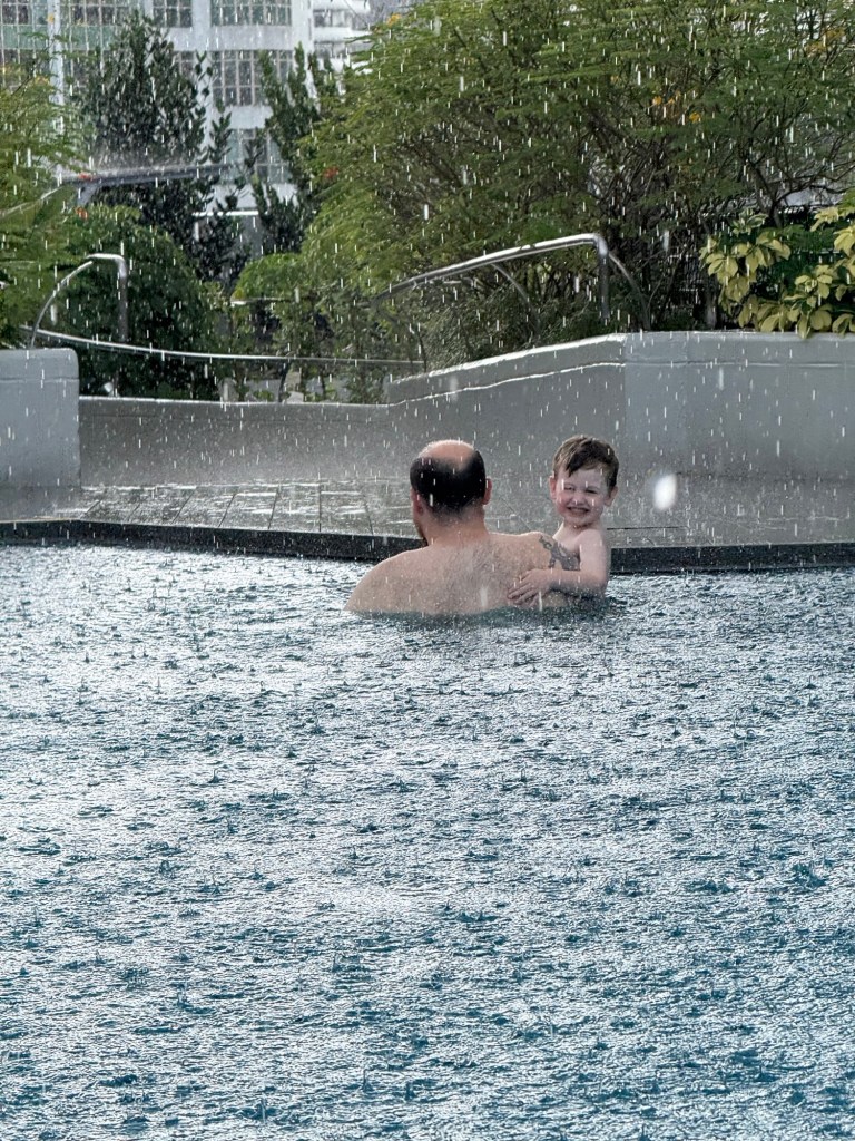 We took the bus home after lunch and chilled for a bit. We went to the hotel pool so Julian could play on the playground and Ronnie could swim. It was bucketing down and Julian ended up getting in the pool too! Once the thunder and lightning arrived we headed back inside.