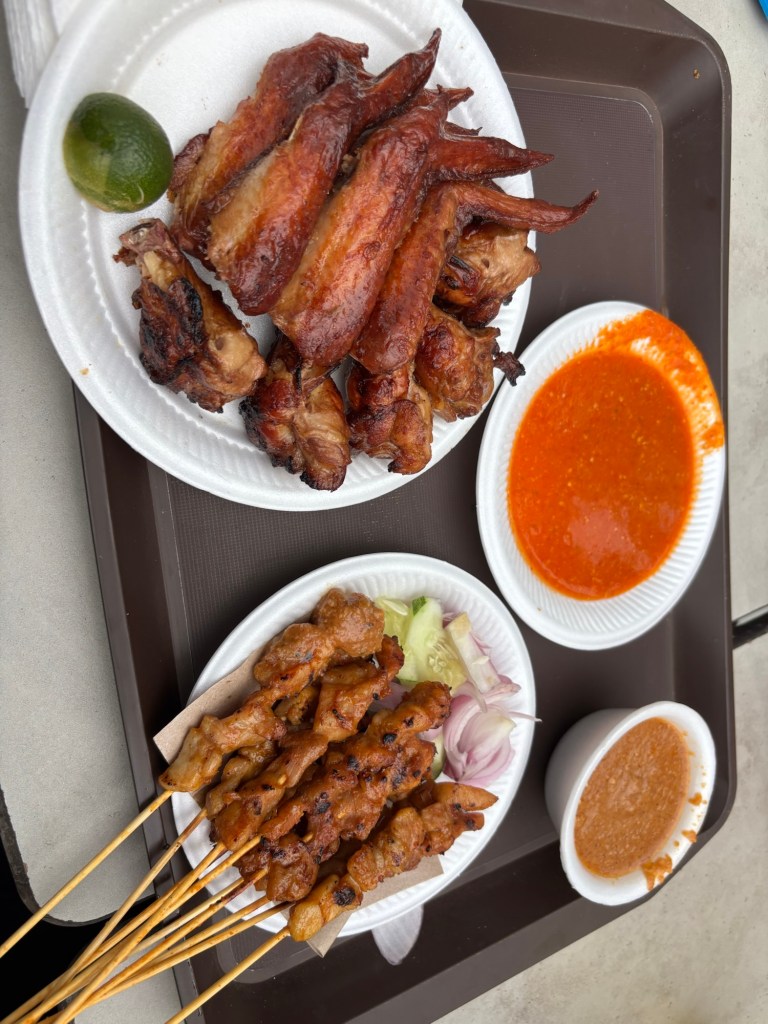 For food we got chicken wings and satay from a stall that has been previously Michelin recognised. We also got carrot cake but it’s not the dessert kind. We got a mix of the black and white version. The black is radish cooked in a sweet soy and the white is like an omelette with radish served with chilli sauce. All of it was very nice.