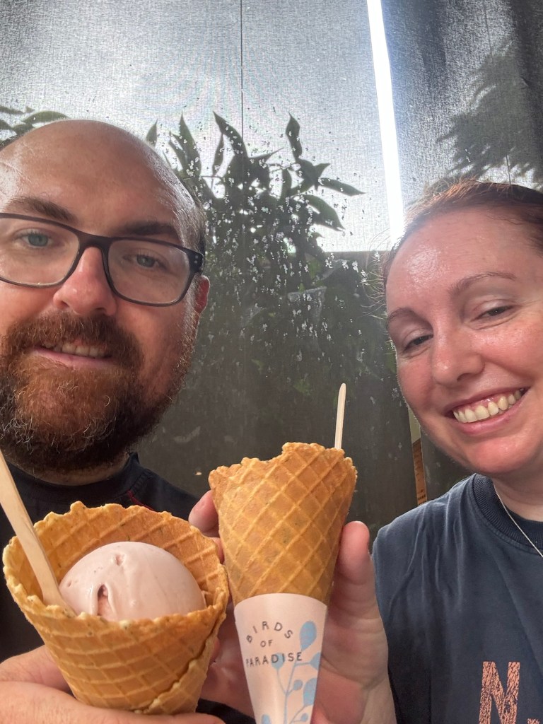Then to get to the next park we had to jump on the shuttle bus where we arrived at bird paradise. Before we went in we grabbed a strange gelato at a place called birds of paradise (which usually exists separate to bird paradise) to have some ice cream. The main flavour which we tried was Strawberry Basil which was strange but somehow worked. We also tried Hojicha sea salt which wasn’t as good. They came in a thyme cone which was also strange but not bad.