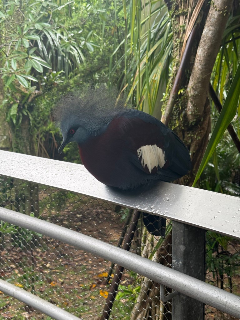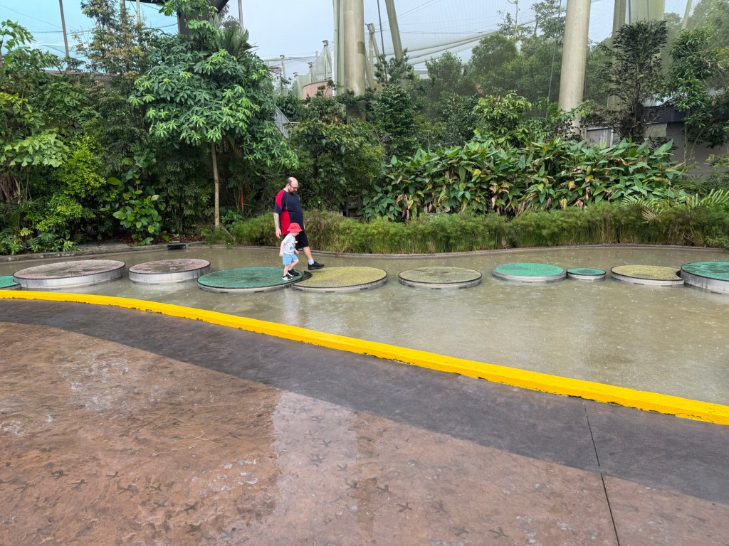 We went into bird paradise where it started raining. They have all of the different lands which are connected via elevated walkways and separated by interactive information rooms. In each land, the birds are just out and about and amongst you. It’s pretty cool.