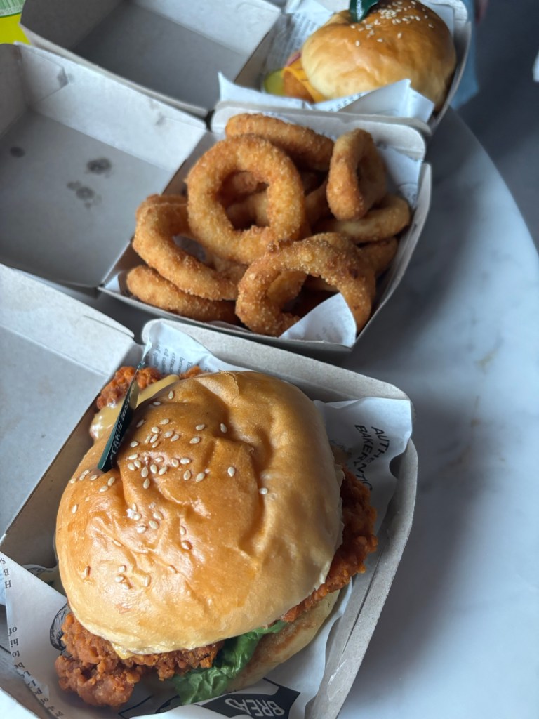 We went out briefly for dinner to a burger joint just up the road. Penang is known for its incredible street food which we will be getting all up in over the next few days. We needed something easy and familiar for our travel day and found it close by. A chicken burger, a fish burger and some chips did the job.